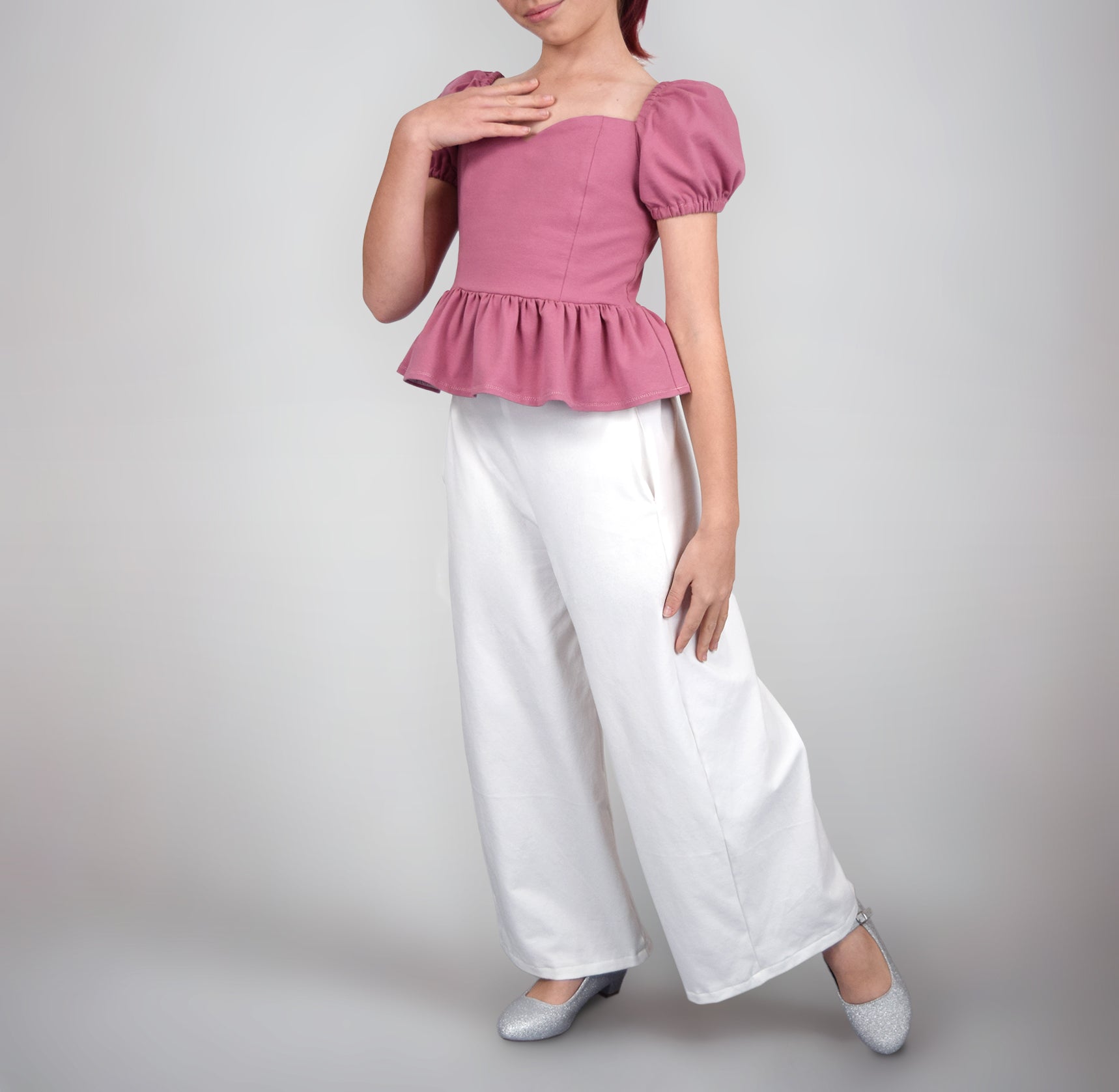 Composé du Top Yasmine, à découpes princesse et dos extensible, et du Pantalon Yasmine, ample et fluide, cet ensemble s’adapte à toutes les envies : tenue du quotidien ou version plus féérique selon les tissus choisis.